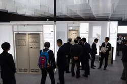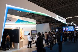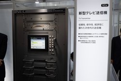 NECのブースでは、スカイツリーなどで電波を送信するために使用される「新型テレビ送信機」など、多くの新型送信設備が正面に展示された。2003年に地デジ放送が始まってから15年が経ち、システムの更新期にさし当たっているためのモデルチェンジで、従来から40 - 50%ほど消費電力を低下させたという。担当者によると、大きな電力を使う設備のため、この消費電力の低下によって電気代が数十万単位といった、かなりの削減に貢献するとのことだ。
