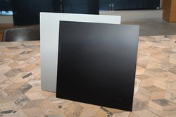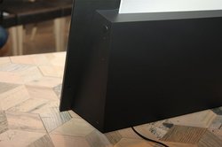 Lyric Speaker Canvasは7月に発表されたモデルで(関連ニュース)、レコードジャケットを立てかけたような、正方形の2枚のボードを組み合わせたデザインで、ブラックカラーの前面部が歌詞を表示、シルバーカラーの背面部がスピーカーとなっている。