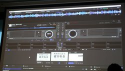 スキマスイッチの大橋卓弥氏、常田真太郎氏を招いたトークセッションでは、Lyric Speaker Canvasを使って『未来花(ミライカ)for Anniversary』『全力少年』の2曲をデモンストレーションした。