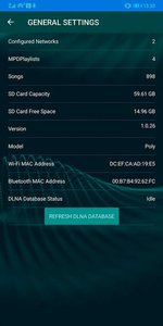 ステータス画面は、SDカードの容量、使用可能な容量とソング番号、ソフトウェアのバージョン、モデル番号情報などのシステムデータを表示。さらにWi-FiとBluetooth、MACアドレス、設定されたネットワークの数、利用可能なMPDプレイリストも表示できる。またDLNAデータベースの更新ボタンを使用すると、新しい音楽がSDカードに追加された際にインデックスの作成および再作成が可能になる。