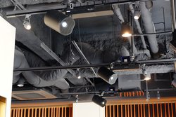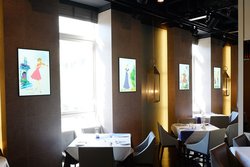 またプロジェクションマッピングからイメージされるような大がかりなものではなく、スポットで映像演出が行えることもポイントだ。今回の投写内容は背景イラストだけがプリントされたA2サイズの額縁が壁面5箇所に飾られており、そこに楽器を持った人物を映し出すというもの。音楽に合わせて、楽器を演奏するアニメーションが表示され、食事を楽しむための場所に合った雰囲気を演出してくれる。