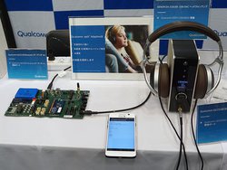 クアルコムのブースでは、今年のIFAで発表された新しいコーデック「aptX adaptive」を体験可能。イヤホン・ヘッドホン向けのBluetoothオーディオプラットフォーム「QCC5100」を使った開発ボードでのデモを体験できる。