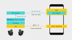 新開発の制御ソフトウェアは、同社の音声読み上げに対応したBluetoothイヤホン「Zeeny」にも搭載予定となっているクアルコム「Audio Development Kit」をベースに構築したもの。ハードウェアにはクアルコムの最新SoC「QCC5121」とそのDSP、接続された5種のセンサーを制御するモジュール「XR Sense」、「Qualcomm GAIA」を拡張したBLE対応通信制御モジュールを搭載する。