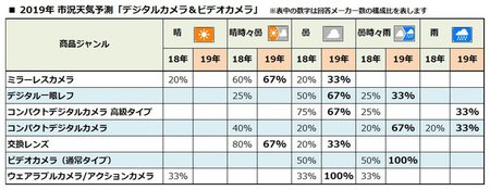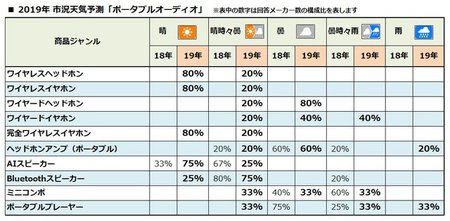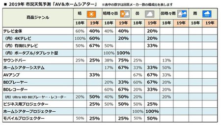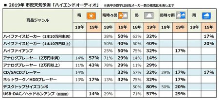 メーカー各社に行ったアンケートで、有力商品ジャンルの2019年の景況感を、「晴」「晴時々曇」「曇」「曇時々雨」「雨」の5つの空模様で、任意のジャンルについてご回答頂いた。各表はそれぞれの商品ジャンルにおける回答を、天気ごとの構成比として表したもの。「18年」と書かれているのは、前年の同アンケートの結果だ。