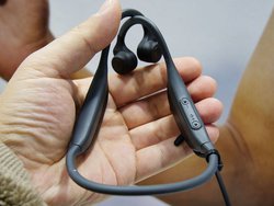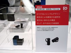 さて、今回同社が展示した中で最も画期的なものは、なんと言っても骨伝導技術で音を出す、左右分離型・完全ワイヤレスイヤホンだろう。残念ながらまだ参考出展の段階で、実際に装着したり音を聴くことはできなかったが、今年6月頃に発売する予定だという。