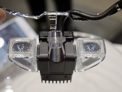 COLORLINK JAPANは、映像鑑賞を想定したヘッドセット用のレンズユニットを2種類展示していた。一つは0.7インチ/16対9、フルHD解像度の「TPF-70-DC」で、もう一つは0.5インチ/4対3、UXGA(1,600×1,200)解像度の「TPF-50Dx」だ。