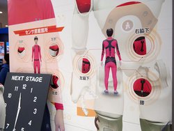 ブースでは、男性の肘や両脇、腰にC-STRETCHを貼り、その動きデータをWi-Fiでロボットに送信。人の動きのとおりにロボットを動かす、というデモを行っていた。男性が肘を伸ばすしたり、腰をひねったりするとロボットもそれに追随する様子が可愛らしく、来場者から喝采を浴びていた。