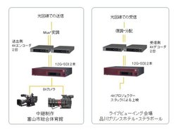 中継方法として、8Kカメラで制作された映像から32:9の画角を抜き出し、現行の4Kエンコーダー/デコーダーを用いて伝送。今回はより簡易とするSQD方式で伝送を行い、送受信時の確認などの作業効率化と、伝送帯域の経済性を両立させたとのこと。