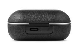 充電ケースのデザインも改良。外側は本革を使用し、内側にはイヤホン本体の各カラーに合わせて、アルマイト加工を施したヘアライン仕上げのアルミニウム製収納パーツを配置。前面には充電状況を表すLED、背面には3つのLEDランプによりケースで残り何回フル充電できるかが確認できる。充電端子はUSB-Cを採用した。