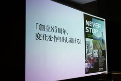 本日都内で発表会が開催された。冒頭、「これまで設置したくてもスペースの制約でプロジェクターを置けなかった、あるいは投写できなかった場所に、高輝度・高画面の投写ができる画期的な製品」と、代表取締役社長・COOの助野健児氏は本プロジェクターを紹介。また、「創立85周年を記念して、満を持して出す製品。この製品で世界のプロジェクター市場にゲーム・チェンジを起こしていく」と述べた。