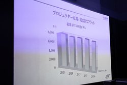 市場の動向について助野氏が述べたところによると、プロジェクター市場はほぼ横ばいで、その理由は「設置済みプロジェクターの買い替えなどが需要のほとんど」だという。これに対し、新たな設置場所・用途を広げる製品を開発することで、新たな製品を創造し、ユーザーを増やしていきたいとのことだ。