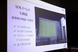 またホテルなどのフロントでは、投写距離が短く、また天井が高かったりと設置できるプロジェクターは今までなかったが、今回の製品でそのニーズに答えられると説明。さらにショッピングモールでは円柱に広告などを投写できたり、今まで櫓を立て、数メートル離れた場所から投映しなければいけなかった屋外イベントでは、大画面を低い場所・近距離から投映できるなど、超短焦点・幅広いレンズシフトが活かせる場所は多いとのことだ。