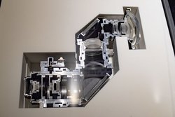 本プロジェクターには20枚以上のレンズと2枚のミラーが搭載されているが、これは製造過程で職人により、1点1点調整が行われているとのこと。具体的には300インチのスクリーンにテストチャートを投影し、回転の6方向すべてで周辺部まで高い解像度が出るように調整されている。またレンズの前玉として搭載され、超短焦点を実現されているという大口径の非球面レンズを量産する成形技術も同社の強みとのことだ。