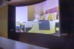 フロント・サイネージ デモでは、先述したホテルのフロントが模してあり、アーチ型のスクリーンに映像が投映された。本体が見えないため空間デザインを損なわないほか、カウンターにスタッフが立っても投写イメージに干渉しないという。