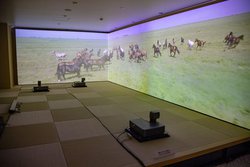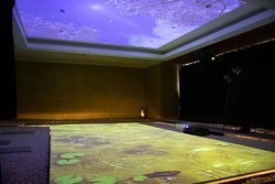 またエントランス デモでは、2台のZ5000を天井と床に平置きで設置されており、天面スクリーン(337インチ相当/約7,600W×4,200Hmm)、床面スクリーン(272インチ相当/約6,000W×3,000Hmm)に投写。こちらではレンズシフトの広さが生かされたデモとなっていた。