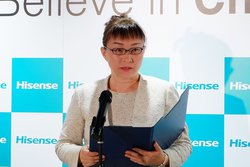 本日ハイセンスジャパンは、本シリーズのメディア向け発表会を実施。冒頭、ハイセンスジャパンの李文麗代表取締役社長が登壇し、「昨年、レグザエンジンの画質を受け継ぐ『A6800』シリーズを発表したが、今回、さらにグレードアップさせたレグザエンジンNEO plusとVIDAAを搭載し、これまでにないほどの画質と使いやすさを備えた3モデルを発表できた。また今後もスポーツへの取り組みも、サッカーを中心に力を入れ、UEFA2020のオフィシャルスポンサーとして応援していく」と挨拶。