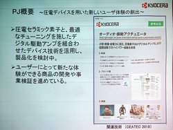 また、京セラとの取り組みは、京セラが開発した圧電デバイスを用いて新たなユーザー体験創出を狙うというもの。京セラ 研究開発本部の横山敦氏によれば、「まだ具体的に紹介できる段階ではないが、昨年のCEATECで参考展示していたオーディオ振動アクチュエーターを用いて、一般消費者の皆さんに新しい価値を提供できるような商品を考えている」という。