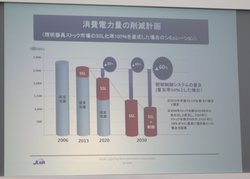 照明器具ストック市場のSSL化率100%を達成した場合の消費電力量の削減効果についても言及。2020年度末にSSL化率50%とすると、消費電力量は2013年度比で約20%削減。さらに2030年度でSSL化率100%に到達すれば、2013年度比で約50%の削減を実現すると見込む。さらに照明制御システム等の導入によりさらなる省エネ効果が期待でき、一般的なシステムの導入で約10%程度の効果が見込めるという。「政府目標である、2030年度でのCO2量2013年度比26%削減に対して、非常に大きな貢献ができる」。