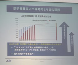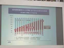 2030年度までのSSL化へ、LED以外の従来光源の照明器具が減じていき、LED照明器具が伸長すると予測。これまでの「Lighting Vision 2020」で掲げられていた2020年時点でのLED化率50%目標については「ほぼほぼ達成の見込み」とし、「2030年度LED化率は少なくとも98%にもっていきたい。ただ使用時間が非常に少ない部位に使われている器具やランプは、2030年時点でも既存光源が使用されつづけるだろう。しかし放置するつもりはなく、業界挙げて古い照明器具の取替え促進のキャンペーンを進めたい」と語った。2025年頃からはLED照明器具からLED照明器具への更新需要が見込まれている。またLEDランプを使用してのLED照明器具化も一定の需要を見込む。