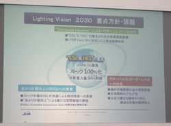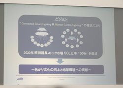 あかりの質向上とSDGs(2015年に国連本部で採択された社会課題の解決に向け持続可能な社会を実現するための持続可能な開発目標)への貢献については、「ストック市場のSSL化加速による地球環境への貢献と、あかりの質向上による新たな空間価値の創出を重点課題とする」と語る。2009年から2019年は省エネを目的としてLED照明が飛躍的に普及拡大、あかりの質向上にも貢献したとして「この10年間はまさにLED化のパラダイムシフトだった。しかしその波も終焉を迎えつつある。そこで、さらに大きな波であるConnected Industriesのパラダイムシフトに上手に乗れるかどうかが重要」とする。