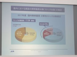 ここで道浦氏は国内照明器具市場について言及。2017年度末時点で、国内における既設の照明器具台数(ストック台数)は、17億2900万台と推定。その内訳は、住宅用照明器具が9億6700万台、非住宅用屋内照明器具が7億2500万台、非住宅用屋外照明器具が3700万台。またストック市場におけるSSL化率は約34%で、「約1/3がLEDなどの照明器具に置き換わっていると認識する。これをベースにすると2018年度末は約40%ほどと推定する」とした。