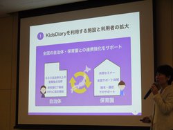 全国の保育現場において、全体の3割にあたる約9,000の施設が保育用のアプリを導入しているとのこと。「Kids Diary」は2019年3月時点で全国約250の施設に導入されているという。今後2年から3年のうちに、シェア1割を目指していくとの目標が語られた。