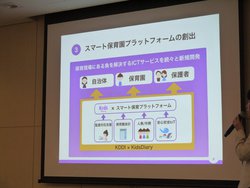 ここでKDDIが担うのは、「Kids Diary」を利用する保育園と利用者の拡大、さらに保育園以外の学童保育施設や幼稚園、習い事塾などへの活用シーンの拡大(市場拡大)。最終的には、保育園会計や監査業務対応、人事・労務管理、安心安全対策などとも連動させ、保育の現場に対する大規模な“スマート保育園プラットフォーム”の創出を目指していくという。「KDDIは地域活性化支援事業を通じて、全国の自治体と強固な接点を持つ。ここが類似サービスとの差別化ポイントになると思う。自治体の悩みも聞き、Kids Diaryを提案していきたい。またより深いICT化への実証実験も行っていく。またシステムが定着するようなセミナーの開催など、保育園へのサポートも実施する」。