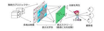 裸眼で自然な3D映像を表示できるという“アクティナビジョン”システムも登場。複数カメラで撮影した多視点映像から取得した被写体の光線を、複数のプロジェクターと表示光学系を用いて再生することで、水平・垂直方向に動いても自然な3D映像を見ることができるという。