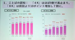「4K」という言葉を9割近くの人が知っている( “気がする” を含む)と回答しており、2017年7月以降高止まりしているとのこと。また、「8K」という言葉の認知率も今回調査で7割を超え、「世の中に徐々に浸透してきている状況が伺える」とした。