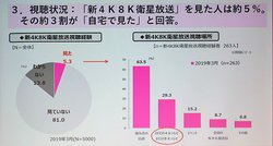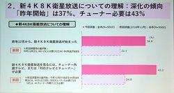 昨年12月から新4K8K衛星放送が始まったことを知っていた人は、全体では4割弱。新4K8K衛星放送の視聴にはチューナー内蔵テレビもしくは4Kテレビとチューナーが必要であることを知っていた人も4割弱となっており、「引き続き理解浸透を図る必要がある」とした。
