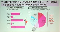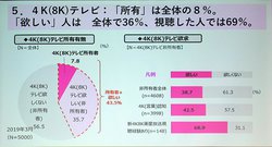 4K(8K)テレビ所有者は全体の7.8%。欲しい人は35.7%で、テレビ所有者と “欲しい人” を合わせると4割を超える。新4K8K衛星放送への関与が高いほうが4K(8K)テレビを欲しい人の割合が高く、新4K8K衛星放送を視聴したことがある人たちでは7割近くの人が4K(8K)テレビが欲しいという回答結果となっている。