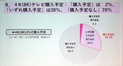 4K(8K)テレビ非所有者のうち、いずれ購入予定と回答した人は約3割で、7割は購入予定なしと回答。購入予定がない理由として、テレビにお金を使いたくないということや、価格が高いということが上位にあがっている。