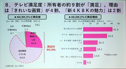 その一方で、4K(8K)テレビ所有者のテレビへの満足度は9割近くと満足している人が非常に多くなった。満足理由としては「画質のきれいさ」を挙げる人が最も多く4割を超え、「新4K8K衛星放送の番組が魅力的」と回答した人も2割弱いた。