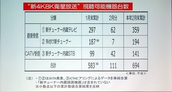 ただし、例えば4Kチューナー内蔵テレビであれば、1月末までの累計が29万7,000台だったところ、2月は6万2,000台と数値が落ち込んだ。「12月の放送開始前後は非常によく売れて、家電店から在庫がなくなるほどだった。しかし1月下旬から2月にかけては少し足踏み状態になっている」とした。