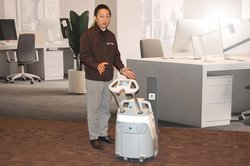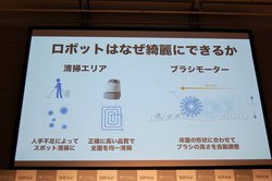 清掃エリアはテニスコート約2面分に当たる500m2を1時間で清掃する。「清掃をロボット化できるのは、結局は床清掃のところだけ。トイレ掃除など人の作業が6〜7割は残る。それを人がやっている間に、ロボットに床清掃を終えてもらうスピードが求められる。家庭用ロボットでは1時間でせいぜい100m2。実用には耐えられない」と説明する。