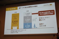 同社が示した関東地区246邸のHEMSデータをもとにした電力使用状況は、1軒あたりの平均発電量は5,400kWh/年。これに対する消費電力量は、日中の自家消費が2,100kWh/年、蓄電池に貯めて夜に活用するのが2,300kWh/年で、計4,400kWh/年。すなわち、1,000kWh/年の余剰電力が発生している。「その有効活用を提案するのが今回の新サービス」と訴えた。
