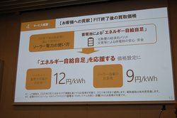 4月15日より、セキスイハイムグループ会社のセキスイファミエスが、FIT終了を迎えるユーザー向けセミナーや住宅訪問を展開。本年度対象となる6万棟のうちの10%を目標に、蓄電池導入によるエネルギーの自給自足を提案。さらに、それを応援するサービスとして位置付けられるのが余剰電力を買い取る「スマートハイムでんき」で、買取料金はソーラー+蓄電池搭載の場合は12円/kWh、ソーラーのみでは9円/kWh。なお、買い取り価格は毎年度見直しを行う。