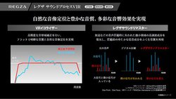 また、Eilex社のPrism技術を採用した「VIRイコライザー」と、同じくEilex社のFocus技術を採用した「レグザサウンドリマスター」という2機能から成る「レグザサウンドプロセスVIR」を搭載。「VIRイコライザー」が高精度な全帯域補正を行うことでフラットで明瞭な音質と自然な音像定位を実現し、「レグザサウンドリマスター」によって放送などの音声圧縮時に失われた微小信号を復元することで、圧縮前の倍音成分を含む音質の再現を図っている。