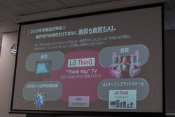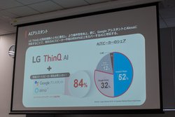 独自のAIプラットフォーム「ThinQ AI」も改良。同時に、Googleアシスタントにも対応。リモコンから音声入力を行うと、入力した内容に応じて最適な情報を提供できる音声アシスタントが自動的に選択される。また、発売後アップデートによりAmazon Alexaにも対応する予定となっている。ThinQ AIやUIまわりの機能は同時発表の有機ELテレビと共通している(詳細はこちらの記事を参照)。