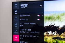 音声面でもAIが活用されており、視聴中コンテンツの2ch音源から映像に適した5.1chバーチャルサラウンド音源を生成する「AIサウンド」、多機能リモコン“マジックリモコン” を用いて視聴環境を分析し音響特性を最適化する「オートサウンドチューニング」などを搭載。また、内蔵スピーカーはドルビーアトモスに対応する。