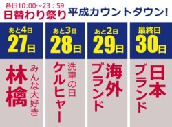 セール商品について詳しく明かされてはいないが、27日は「みんな大好き 林檎」、28日には「洗車の日 ケルヒャー」、29日「海外ブランド」、30日「日本ブランド」が販売。それぞれ午前10時から終日まで開催される。
