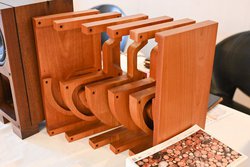 AudiFillは、今回最終チューニングが初めて展示されたスピーカー「Concept-SOLA(240,000円・税込/ペア)」の音出し展示を実施。筐体にはひのきを採用する。この素材を採用するにあたって、マホガニーなど30種類以上の木材を視聴したというが、最終的に奈良県・吉野産のひのきの採用に至ったという。