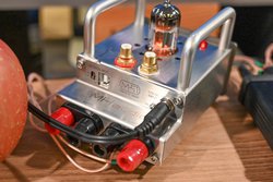 MHaudioは、近日中に上記GREEN FUNDINGにおいて発売予定の真空管アンプ、「UA-1」を出展。このアンプは真空管とデジタルアンプの2つを用いたハイブリッド構成となっており、アナログ入力とUSB入力に対応している。