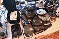 そのほか、昔なつかしいCDプレーヤーが多数展示。値札が貼られているが、これは集める際に購入したものをそのまままにしているとのこと。実際にCDを入れて再生・試聴することもできる。これ以外にも多くのヘッドホンなどが積まれていた。
