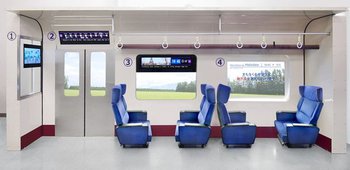 また参考として、ガラスの両面に映像を表示することができる「PARTITIONシリーズ(7月より販売予定)」をはじめ、列車扉上部の映像を一画面で途切れなく表示する「軽量大型ワイドスクリーンタイプ」、大型ワイドスクリーンを窓ガラスの上部に組込んだ「列車用窓バータイプ」、窓ガラスに透明ディスプレイを組込んだ「列車用窓透明タイプ」といった列車における開発中の製品も紹介されている。