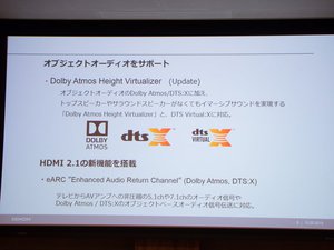 新しく搭載される機能は多岐にわたり、その中のひとつが「Dolby Atmos Height Virtualizer」。バーチャル処理により、イネーブルドスピーカーが無い2ch/5.1ch/7.1chといったスピーカー環境でも、天井方向を含むイマーシブオーディオを仮想的に再現することができる。本機能は、発売後に提供されるファームウェア・アップデートにより利用可能となる。