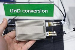 同社の展示でもう1つ注目したいのが、参考出品されたb<>com社のSDR-HDRコンバータモジュール「Universal HDR Converter Box」だ。NAB Show2019では「Product of the year」を受賞した製品で、手のひらの大きさほどの筐体に映像信号を入力するだけで、SDRコンテンツをHDRにリアルタイム変換することができる。解像度は4K UHDに対応しており、HDRではHLG/S-Log3/PQ(1000nits)に対応する。