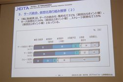続いて、サーバ出荷実績の詳細を、プラットフォーム市場専門委員会委員長・香川弘一氏が説明。トピックスは、需要の中心となるIAサーバが、台数ベースでは引き続き対前年度比95%の25万1,335台と減少傾向にあるものの、金額ベースでは同110%の2143億600万円と、3年ぶりに前年を上回ったこと。