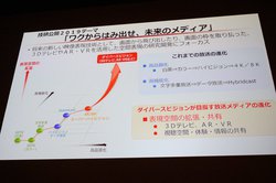 NHK技研の三谷 公二所長は今回のテーマ「ワクからはみ出せ、未来のメディア」を挙げ、「例えばテレビの画面から飛びだすような映像だったり、テレビの枠を飛び出して映像を提供できる3Dテレビ。それからAR・VRの技術を中心として、1年の成果をご覧いただきたいと思っている」とコメント。