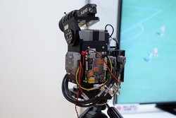 関連した技術として、「スポーツ映像の状況理解技術」というブースでは、AIを搭載したロボットカメラを展示。サッカーにおいて、選手の方向やボールの位置をAIが状況理解することで、カメラワークを自動的に調整できる。またこのAIで生成したメタデータでセンシングを行い、3Dデータを作成することで、自由な視点から見ることのできるVR映像や、左目に3D・右目に実写の2D映像を流すことで3D映像も作れるという。